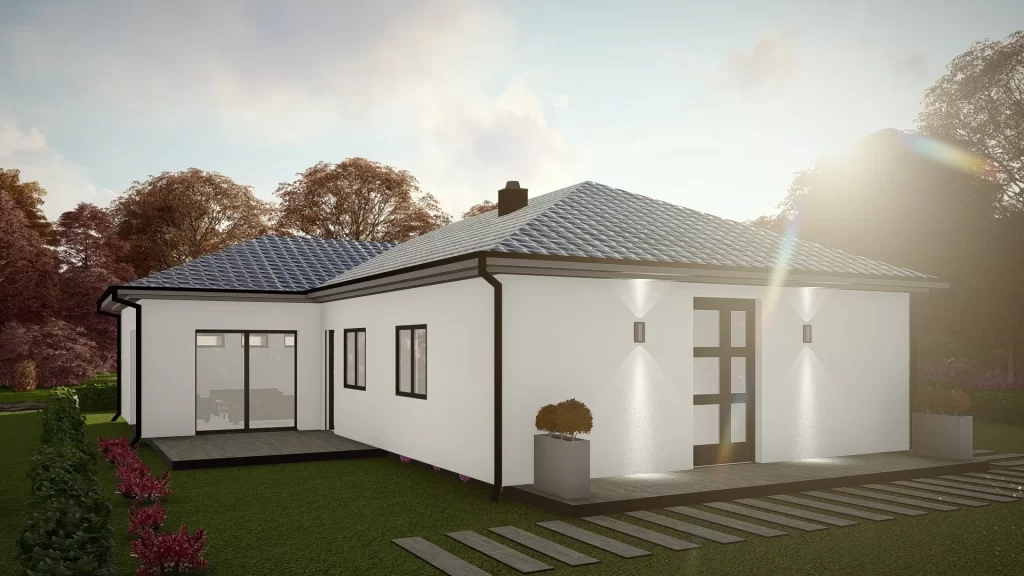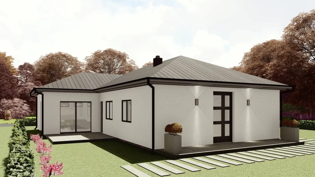 Wir präsentieren Ihnen einen detaillierten Plan eines Einfamilienhauses von 136 Quadratmetern mit einem Swimmingpool und einem schönen Garten. Sein Hauptvorteil ist ein funktionales Interieur, das für die Bedürfnisse einer vierköpfigen Familie konzipiert ist, und es gibt einen geräumigen Dachboden zur Aufbewahrung von Dingen. Das Das Haus ist die perfekte Wahl für diejenigen, die eine klassische Bauweise mit modernen Akzenten bevorzugen. Der Wohnraum befindet sich im Erdgeschoss des Hauses, das von einem geräumigen Wohnzimmer dominiert wird, das mit dem Esszimmer, der Küche und der Speisekammer verbunden ist. Vor ihr Es gibt ein Elternschlafzimmer mit separatem Raum für Garderobe und WC sowie zwei Kinderzimmer und ein Badezimmer..